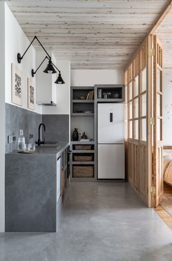 Хозяйкой небольшой квартиры в новостройке стала дизайнер Катерина Караваева. Именно для проживания своей семьи она создала легкий интерьер с атмосферой тропического острова. Планировка от застройщика не устраивала новых владельцев небольшой квартиры в монолитном доме. Поэтому Катерина решила сделать перепланировку, при этом открыть пространство. Так как дома хозяева готовят не часто, то для кухни выделили небольшую зону, а у большого окна разместили спальню. В другой комнате оформили гостиную и обеденную зоны. Кухня с открытой системой хранения выполнена на заказ: фартук, пол и саму мебель задекорировали микробетоном. Стены во всей квартире выровнены и покрашены водоэмульсионной краской теплого белого цвета. А фишкой и гордостью хозяйки стал деревянный потолок из высококачественной лиственницы, которую брашировали и нанесли слой защитного влагостойкого состава. Санузел исполнен в том же стиле минимализм + ваби-саби, где для отделки использовали плитку ручной работы, дерево и микроцем