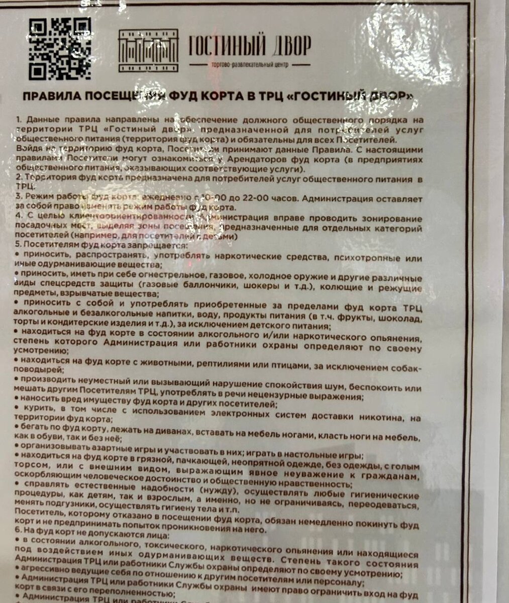 Не ел? Уходи! Тульские казаки патрулируют улицы и территории торговых центров, в частности, зоны фуд-корта. В «Гостином дворе» добровольцы делают замечания посетителям, которые ничего не едят. Об этом пишет Телеграм-канал «т а к и ж и в е м». Патрули ссылаются на правила посещения фуд-корта, где написано, что данная зона предназначена для потребителей услуг общественного питания. Представитель казачества, старший прапорщик Иван, рассказал Телеграм-каналу «т а к и ж и в е м», что казаки помогают сотрудникам полиции в охране общественного порядка. — ГД (имеется ввиду «Гостиный двор») — это место, в котором собираются большие толпы зачастую несовершеннолетних граждан, которые устраивают там драки, распивают алкоголь, ругаются матом, что слышно на весь фуд-корд. Основная наша задача заключается в том, что мы оказываем содействие в охране общественного правопорядка сотрудникам МВД. До этого мы ходили по другим местам. Компании, которые посещают ТЦ с целью встретиться с друзьями, выпить, пот