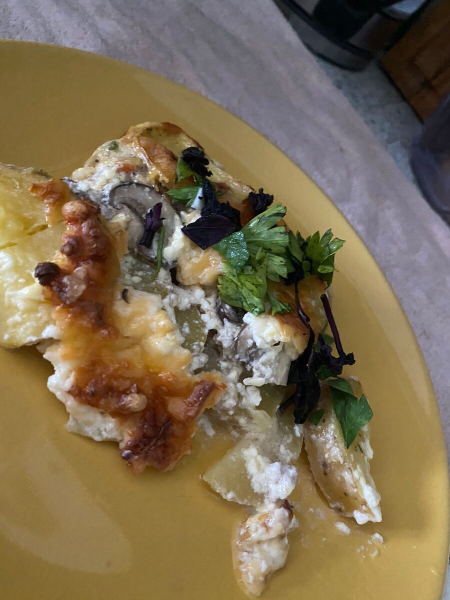 Ингридиенты : Картофель 1кг Фарш свиной 1кг Грибы (любые ) 200 гр Сметана 20% Сыр твёрдый 300 гр Сливки 15% Зелень любая . Режем картофель кружочками и выкладываем на протвень друг на друга . Смазываем сметаной и немного солим . Кладем сливочное масло пару кусочков . Затем слой фарша сырого , его тоже солим и сверху грибы . Затем их тоже смазываем сметаной и кладем сливочное масло . Потом опять слой картошки . Потом это все заливаем смесью сливок и приправ , у меня коркума , перец черный , соль , прованские травы . И посыпаем сверху сыром . Ставим на 150градусрв на 40 минут . Потом на 200 градусов на 10 минут . При подачи можно посыпать зеленью или украсить свежими овощами Приятного аппетита