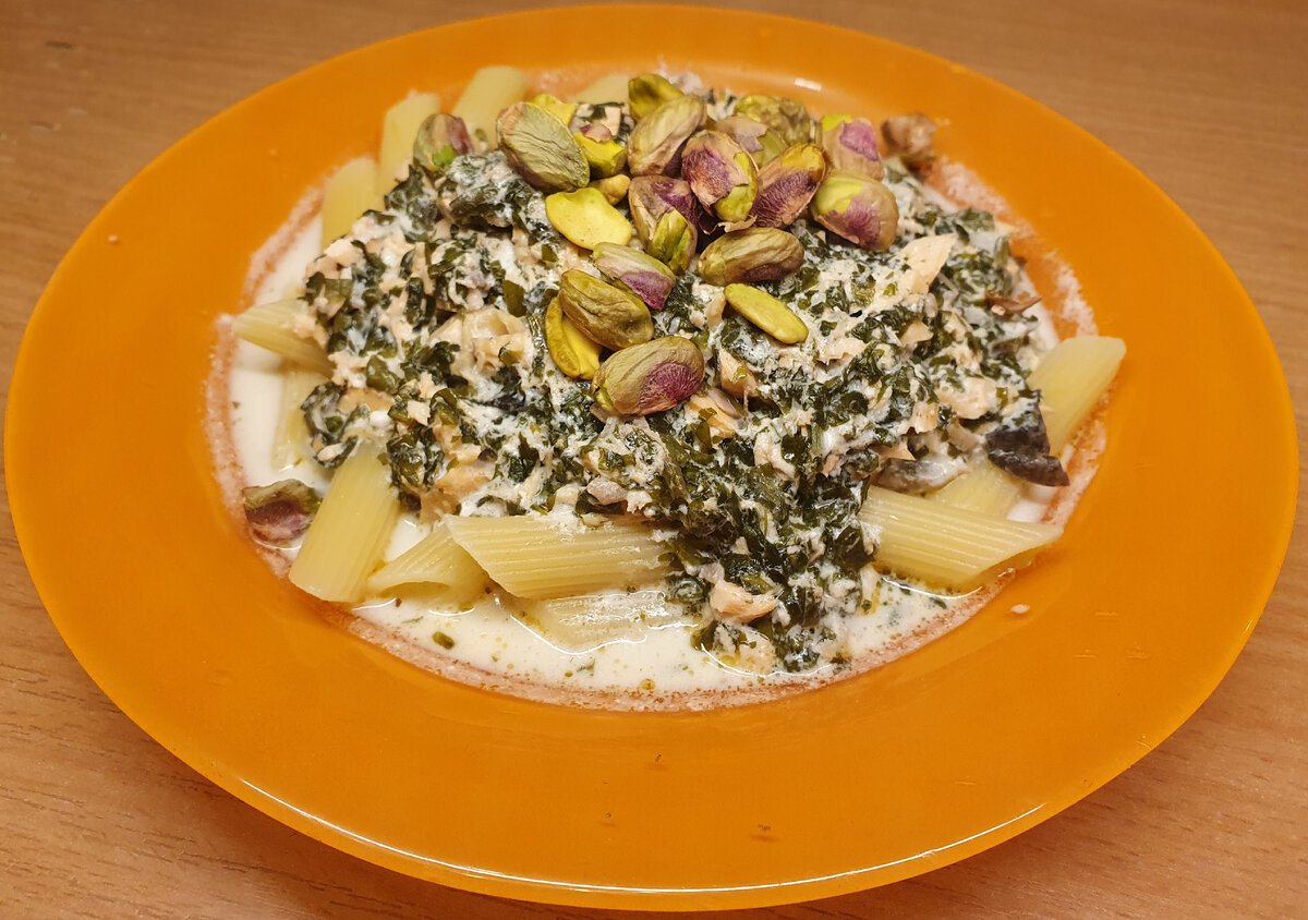 На основе сметанного соуса, использованного мной на днях для гребешков, можно сделать вкуснейшую и очень простую в приготовлении пасту. Соус можно подглядеть тут: Понадобится: паста пенне 150г, филе красной рыбы 200г, щавель пучек, сметана 2ст.л, чеснок 2зуб, прованские травы, фисташки несоленые горсть Приготовить большую кастрюлю с водой из расчета 1л на каждые 100г макарон. Рыбу целым куском обжарить на сильном огне на растительном масле до корочки. Влить в сковороду немного, буквально 30-50мл, кипятка и тушить под крышкой на слабом огне минут 10. Подготовленную воду довести до кипения и сварить в ней пенне по инструкции до эффекта «аль-денте». Рыбу переложить на тарелку, размять или разобрать на волокна и вернуть в сковороду. Щавель и чеснок с небольшим количеством воды пробить блендером в пюре. Выложить щавелевую массу к рыбе, добавить сметану, приправить пряными травами. Соус перемешать, довести до кипения и снять с огня. Сваренные пенне разложить по тарелкам, полить соусом и прис