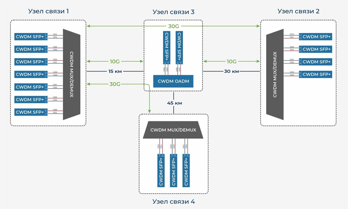 → По одному каналу 10G между узлами связи №1 и №3 и узлами связи №2 и №3. Схема расположения площадок: Исходные данные Решение На оконечных точках (УС1 / УС2 / УС4) были установлены CWDM мультиплексоры/демультиплексоры, на промежуточной точке (УС3) – CWDM OADM мультиплексор ввода-вывода на три направления. OADM позволил связать площадки в соответствии с техническим заданием. Для реализации проекта были использованы трансиверы SFP+ большой дальности и мультиплексоры с минимально возможными для этих модификаций затуханиями. С целью выбора технологии был проведен ценовой анализ технических решений, созданных на базе CWDM и