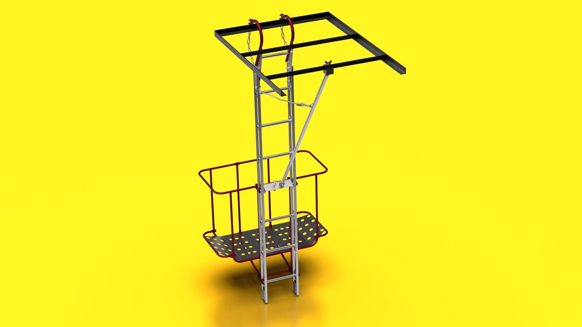 Лестница подвесная с навесной площадкой длиной 2,8 м предназначена для размещения на ней не более одного электромонтера с инструментом для проведения монтажных и ремонтных работ на поддерживающих зажимах, гирляндах изоляторов и проводах на промежуточных опорах ВЛ. Подвесная лестница с навесной площадкой изготавливаются в климатическом исполнении УХЛ категории 1 по ГОСТ 15150. Лестницы выпускаются в трёх модификациях длиной 2,8 м, 3,4 м и 4 м. В состав подвесных лестниц с навесной площадкой входят: лестница, выполненная из алюминиевого сплава, снабженная захватом, состоящим из подвесных крюков с цепными стропами, выполненных из стали, упора, выполненного из алюминиевого сплава и навесной площадки. Навесная площадка может легко переставляться с шагом 300мм в пределах длины подвесной лестницы на необходимый для работы уровень. Упор удерживает лестницу с установленной на нее площадкой в вертикальном положении. Упор устанавливается на любую из ступенек лестницы. В верхней части упор имеет