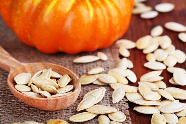 Тыквенные семечки богаты цинком, триптофаном и полиненасыщенными жирными кислотами. Они улучшают эластичность кожи и способствуют заживлению ран. Также семена тыквы содержат антиоксиданты — каротиноиды и витамин Е — которые могут помочь избежать болезней сердца и понизить уровень холестерина.