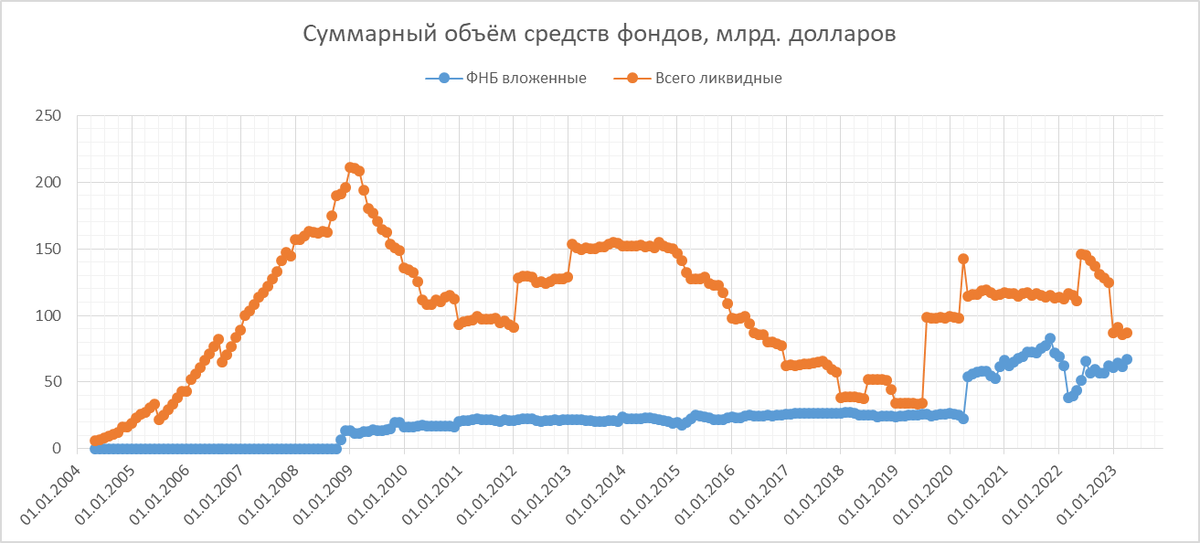 Посмотрим на опубликованные сегодня данные по ФНБ. В рублях ФНБ вырос (с 11,1 до 11,9 трлн.) - что неудивительно при ослаблении рубля. Однако несколько вырос он также и в долларах, как ликвидная, так и вложенная часть. Но если смотреть в натуральных величинах, то имеем такую картину по основным компонентам ликвидной части: продолжающееся падение невысокими темпами, составившее по итогам квартала около 5%. Величина же ликвидной части ФНБ в долларах выросла, я так понимаю, в основном за счёт роста курсов валют и цен на золото в прошлом месяце (а вложенная часть выросла, как говорят, за счёт акций Сбербанка). Итого, драматичных изменений ФНБ пока не видно, есть тенденция к снижению ликвидной части (в натуральном выражении), но она достаточно медленная (5% за квартал это 100% за 20 кварталов, т.е. за 5 лет), настолько, что снижение курса рубля приводит к его росту в рублях. Однако надо помнить, что расходование ФНБ как правило происходит не постепенно, а порциями. Пока что, вероятно, для ф