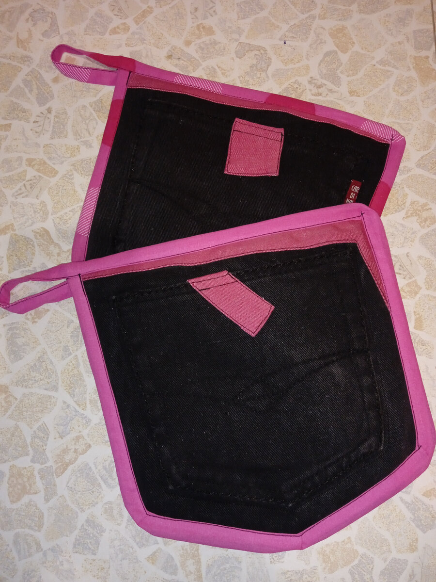 Сегодня наткнулась на джинсовые карманы, уже вырезанные. вырезаны криво, поэтому недостающие части подкроила из розовой джинсы. Пришила розовые части и отстрочила на 0,1 см. На самих карманах вверху небольшие дырочки, прикрыла их аппликацией произвольной формы. Карманы достаточно большие, поэтому настрочить аппликацию было не сложно. Выкроила синтепон и подкладу. Соединила три слоя вместе по краю и строчкой вдоль кармана. Рулика подходящего цвета не нашлось, поэтому использовала полоски ткани, выкроенные по долевой. Пристрочила их к изнанке, рассекая в углах. Срезала углы. Отогнула розовые полоски на лицевую сторону и, подгибая край пристрочила. Вуголках заложила защипы, чтобы лучше легло. Из этой же полосы ткани сделала вешалки и закрепила их простой закрепкой. Прихватки готовы, но обрабатывать край руликом мне удобнее и быстрее. Надеюсь, что статья была вам полезна.