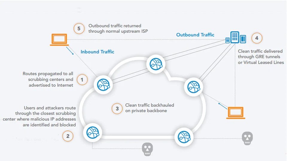 Перенаправление означает перенаправление трафика в другое место, либо для его отбрасывания, либо для фильтрации. Под фильтрацией мы подразумеваем отсеивание DDoS-трафика, определяя его как вредоносный. Эффективное решение по борьбе с DDoS будет делать это, не влияя на работу ваших законных пользователей. Наконец, анализ — это просмотр журналов трафика для сбора информации об атаках, как для идентификации злоумышленника, так и для улучшения будущих действий по обнаружению.