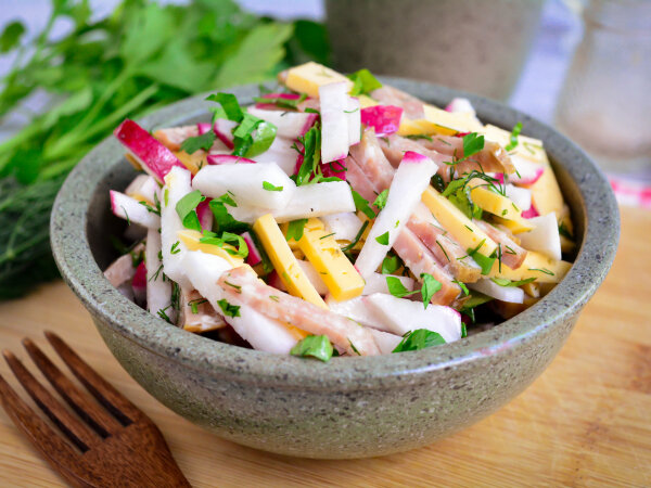 Весенний салатик готовится и съедается очень быстро. Состоит он всего лишь из 3-х основных компонентов. Он будет уместен на праздничном столе и в будние дни на ужин или обед. Сытно, просто и вкусно!