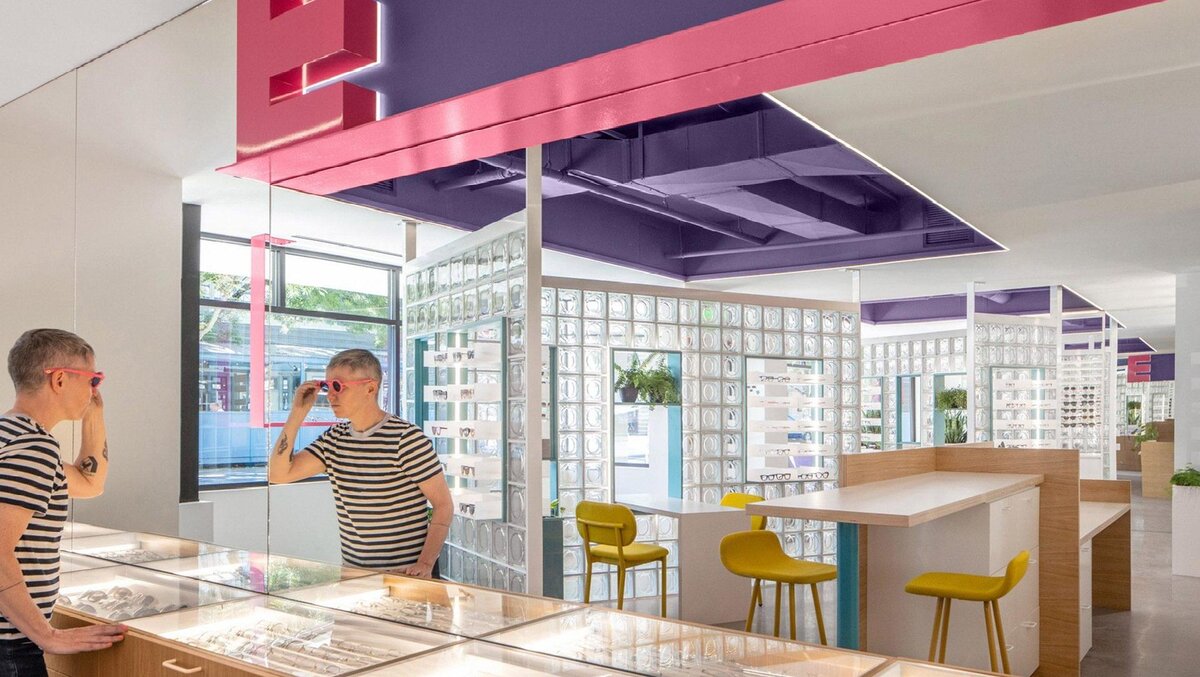 Студия Best Practice Architecture использовала яркие цвета, стеклоблоки и дихроичное стекло для интерьеров модной оптики в Сиэтле Владелец оптики Eye Eye в Сиэтле Уилл Пентекост обратился в студию Best Practice Architecture, с которой уже работал над своим первым салоном пару лет назад. Правда, по сравнению с тем помещением место под новую оптику не могло похвастаться высокими потолками и заметным с улицы фасадным решением. Поэтому архитекторы решили поиграть с цветом и материалами, чтобы превратить пространство в унылом офисном здании в привлекательную и яркую среду. «Клиент предоставил нам полную свободу действий, выделив всего лишь пару важных моментов: он хотел обязательно использовать в интерьере стеклоблоки и светящиеся вывески», — рассказали в студии. Дизайнеры расположили выставочную часть с витринами очков в передней части, выходящей на улицу большими окнами, а смотровые кабинеты и комнаты для персонала — в задней части салона. Стеклоблоки использовали для разделения магазина