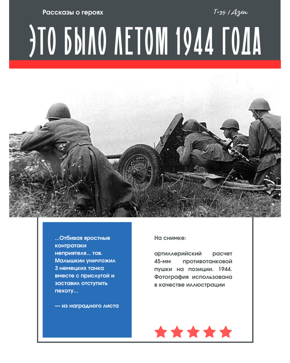 Это было летом 1944 года. Орудие старшего сержанта Малышкина поддерживало огнём стрелковую роту. В полдень немцы пошли в контратаку. Четыре вражеских танка двигались прямо на орудие Малышкина. Гвардейский расчёт не дрогнул. Командир приказал подпустить немецкие машины ближе, чтобы наверняка бить по врагу. Прошло несколько минут, и прозвучала короткая команда Малышкина. Снаряды ударили в немецкую броню. Вот загорелся первый танк, за ним второй. Такая же участь постигла остальных. Мужество русского