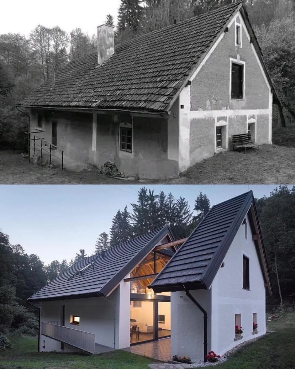 Это старое здание, изначально бывшее мельницей, долгие годы оставалось заброшенным, пока чешская студия @stempel_tesar Architects не дала ему новую жизнь. Двухэтажное здание было разделено на две части, а крыша между частями осталась открытой, чтобы естественный свет и воздух проникали в жилые помещения со стеклянными стенами от пола до потолка. В одной половине дома находятся гостиная, кухня и спальня, а другая служит только столовой или рабочим местом.
