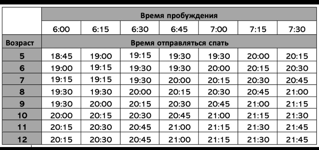 Во сколько правильно отправлять ребёнка спать? Табличка.