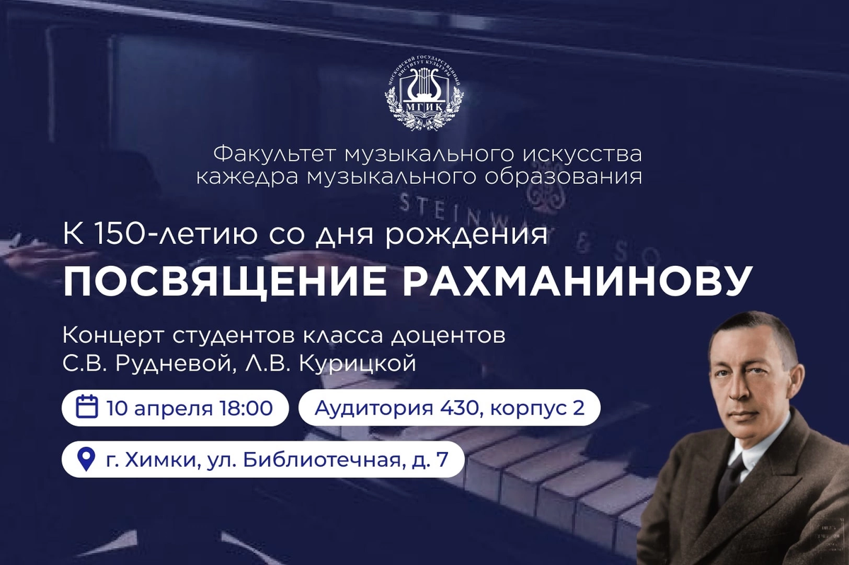 К 150-летию со дня рождения великого русского композитора С.В. Рахманинова состоится концерт студентов класса доцентов С.В. Рудневой, Л.В. Курицкой «Посвящение Рахманинову». Ждём вас: 10 апреля, 18:00, аудитория 430 к.2, вход свободный В программе прозвучит вокальная и фортепианная музыка С. Рахманинова. В концерте примут участия лауреаты международных конкурсов, приглашённые гости. Презентацию подготовили студенты теоретического отделения под руководством М.В. Архиповой.