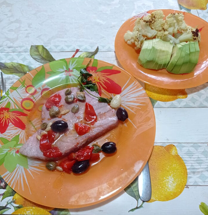 На сковороду налить оливковое масло, разогреть. Добавить чеснок, каперсы, помидоры черри, кедровые орешки, оливки и веточку петрушки. Отправить туда же филе тунца. Полить соком лимона. Под крышкой томить до готовности рыбы. На гарнир - цветная капуста и авокадо. Больше общения и рецептов - в группе "Рецепты для диабетиков" в ВКонтакте! Рецепт на странице Автор рецепта – Карина Ковалёва