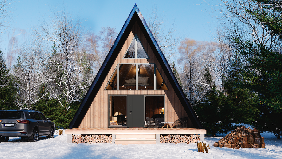 одная дверь Snegir PRO в каталоге >>Дом-шалаш — строение с двухскатной крышей, которая начинается от линии фундамента. Такой дом напоминает букву А, за что его также называют A-frame.