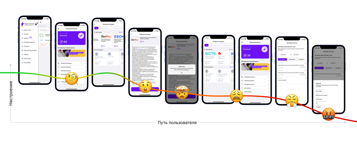Как и в прошлом кейсе (приложение каршеринга Cars7), мы сфокусировались и изучили не весь продукт, а только его часть. В приложении много неудобств и проблем. Средний отзыв в 3.4 (App Store) и 3.1 (Google Play) это подтверждает. Но бонусная программа вызвала у нас самую большую «любовь», и поэтому мы разобрали именно ее в версии для iOS.