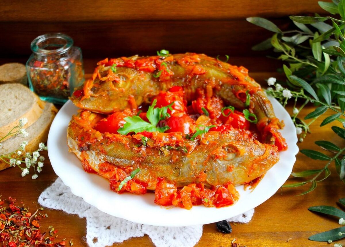 Рыба в духовке с помидорами Ингредиенты: ▫️Рыба (любая) — 4шт. ▫️Морковь — 1шт. ▫️Лук — 1шт. ▫️Болгарский перец — 1шт. ▫️Помидоры — 7шт. ▫️Чеснок — 1 зубч. ▫️Растительное масло — 5 стол.л. ▫️Соль — 0.5 чайн.л. ▫️Сахар — 1 чайн.л. ▫️Перец черный молотый — 0.5 чайн.л. ▫️Перец красный молотый(сладкий) — 0.5 чайн.л. ▫️Итальянские травы — 0.5 чайн.л. ▫️Томатная паста или томаты в собственном соку — 300-400г #Рыба