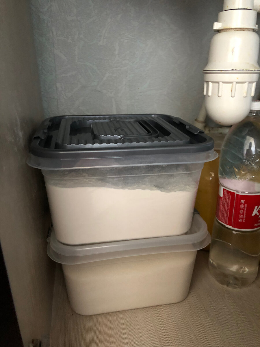Под мойкой, в ведре мы храним картошку, там же у нас стоят два контейнера с мукой и сахаром. Я не любитель покупать большими мешками крупу, но на момент покупки, в магазине были мешки по 5 кг, пришлось брать что есть. Под мойкой стоят банки с мёдом.