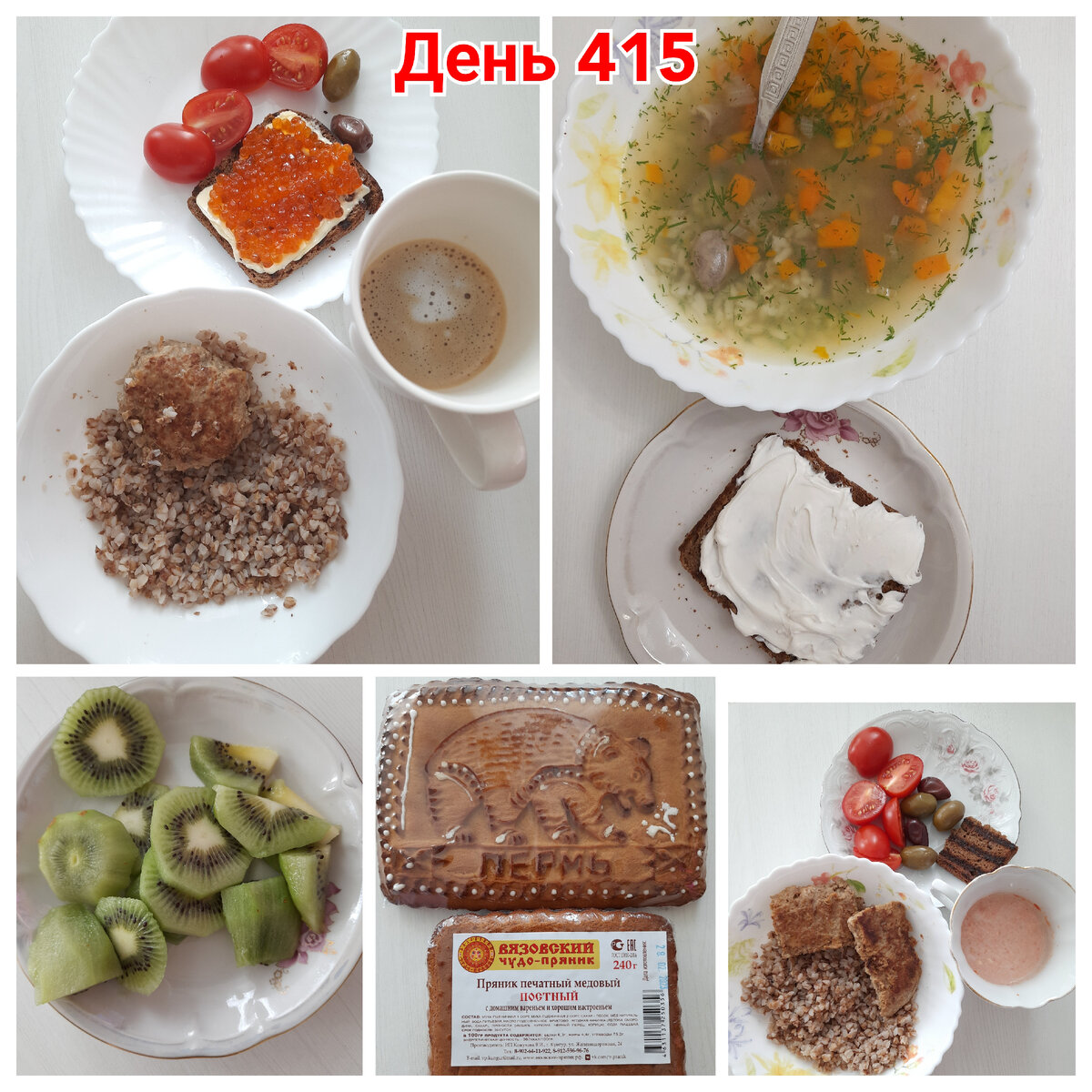 В дне 414 я писала, что потеряла фотографии с меню за несколько дней. Остались только коллажи, которые я делала. Так что решила собрать несколько рационов одну статью. День 415. #Завтрак – кофе с фермерским молоком. Гречка, котлета из дня 414. Хлеб на гриле, сливочное масло и икра. Помидорки черри. Оливки из вкусвилл. Икру подарили родители на 8 марта. Я сама заказывала))) Икра сейчас подорожала и это отличный подарок! Подарки мы друг другу почти всегда заказываем, чтобы не дарить не нужные вещи. Ну а если не заказываем, то дарим еду. Какую-то интересную, необычную, с новыми вкусами или дорогие позиции, которые на каждый день не купишь. Это тоже беспроигрышный вариант. На мой взгляд, гораздо лучше статуэток, которые пылятся на полке))) А Вы что предпочитаете на подарок? Сюрприз или заранее выбранный? #Обед – гречка, квадратные котлеты из дня 414, помидорки черри, оливки из Вкусвилл. И сделала в чашке соус из фермерской сметаны и домашней хренушки. Это такое оригинальное и вкусное соче
