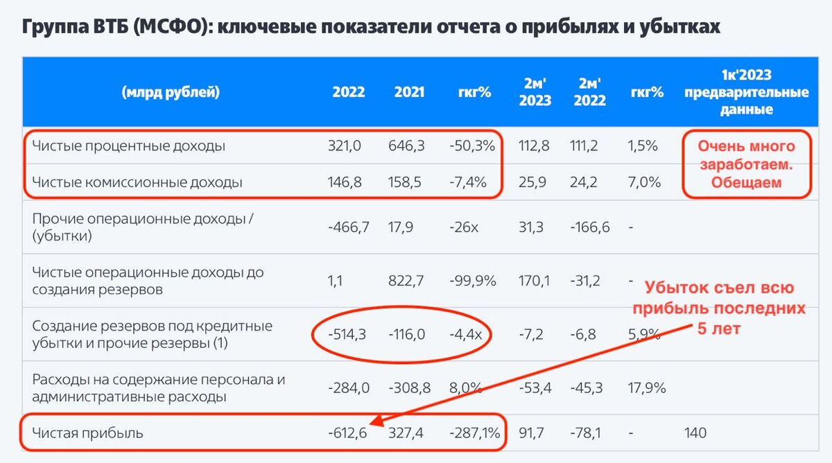 Котировки ВТБ сегодня оказались в аутсайдерах после фееричного пампа в прошлые торговые сессии. В чем же причина этих двух событий? Жадность Рынок сейчас тонкий и любой неликвид разгоняется в считанные часы. То же самое применительно и к акциям ВТБ. Насмотревшись на рост его «зеленого» собрата, ожидая хороший отчет, представляя перед собой мираж в виде дивидендов и воспользовавшись длительной консолидацией, инвесторы начали скупать акции, разогнав их на 26% за пару дней. Осознание После импульса цена ушла в коррекцию. Понимание всей драматичности ситуации пришло к инвесторам уже после публикации отчета по МСФО за 2022 год. ВТБ не стал ходить вокруг да около и сразу списал все кризисные убытки. В итоге чистый убыток составил 612 млрд рублей, откидывая банк на десятилетия назад, аккурат к кризису 2008 года. 612 ярдов - это все, что компания вообще заработала за последние 5 лет. В отчете я нашел одни сплошные дыры. 300 млрд рублей - расходы по операциям с иностранной валютой, чтобы это н