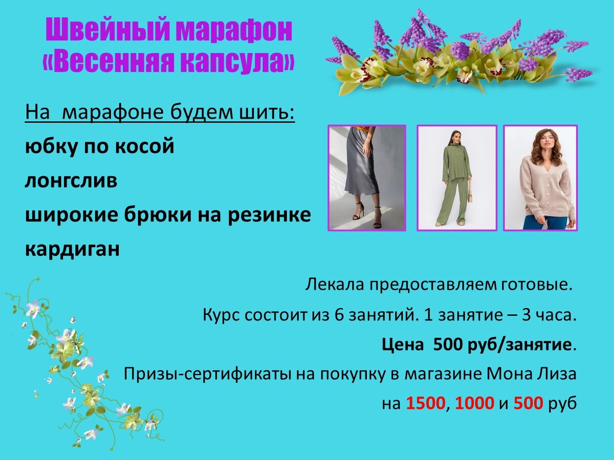 Основные условия приведены выше. По окончанию курса вы получите актуальную мини-капсулу для весеннего и летнего сезона. Вы сможете из 4 изделий скомбинировать 5 комплектов одежды практически на все случаи жизни! Вместе с актуальной, удобной для вас капсулой вы получите: И самое главное!!! Этот курс проводим в форме марафона, а значит присутствует соревновательный момент. Кто первый отошъет все 4 изделия получит сертификат на покупку тканей в магазине МОНА ЛИЗА на 1500руб. второе место - сертификат на покупку тканей в магазине МОНА ЛИЗА на 1000руб. третье место -сертификат на покупку тканей в магазине МОНА ЛИЗА на 500 руб. Подробнее по расписанию. Мы планируем провести 6 занятий.