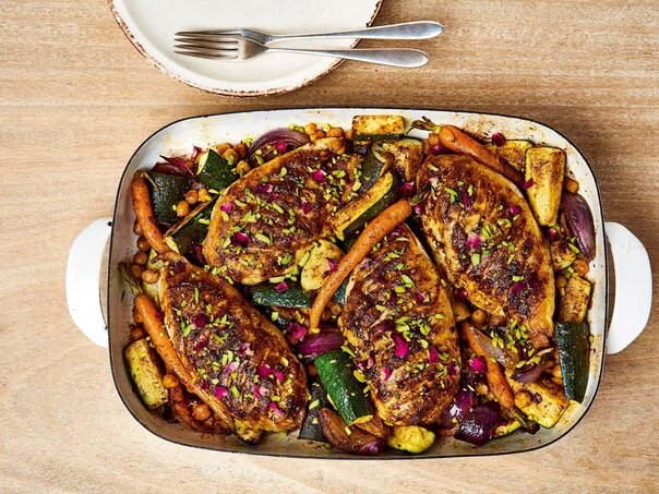 Traybake в переводе означает «запечённый на противне» Такая смесь, как рас-эль-ханут, - отличный, быстрый способ перенестись на марокканские или тунисские базары: стоит только приправить ею овощи и курицу, как в этой запеканке. Только не забывайте о сроке годности молотых специй: через год-два они теряют вкус, так что, если они будут простаивать в глубине вашего шкафа 10 лет, не ожидайте, что у них будет хоть какой-то вкус. На 4 порции: