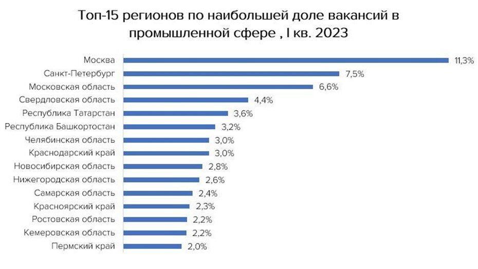 Работодатели СЗФО из промышленного сектора по итогам I квартала разместили более 45 тыс. вакансий, что 25% больше показателей последнего квартала прошлого года и на 87% превышает число вакансий, размещённых в январе–марте 2022 года, подчитали в hh.ru "Таким образом, промышленная сфера на Северо-Западе страны оказалась даже более активной в точки зрения развития, поиска и набора персонала, чем в других регионах России", — отмечают аналитики рекрутингового сервиса. Как отмечается в релизе, из всего объёма вакансий на рынке труда СЗФО каждая шестая вакансия размещена именно в сфере промышленности. Более двух третей вакансий в этой сфере приходится на Петербург (68%, что на 4% больше, чем в конце 2022 года). На втором месте Ленобласть (11% вакансий, число новых рабочий мест за квартал не упало). На третьем — Мурманская и Калининградская область (по 4% в каждом регионе). По стране активность соискателей в секторе промышленности выросла на 53%. Самыми активными в поиске работы в сфере произв