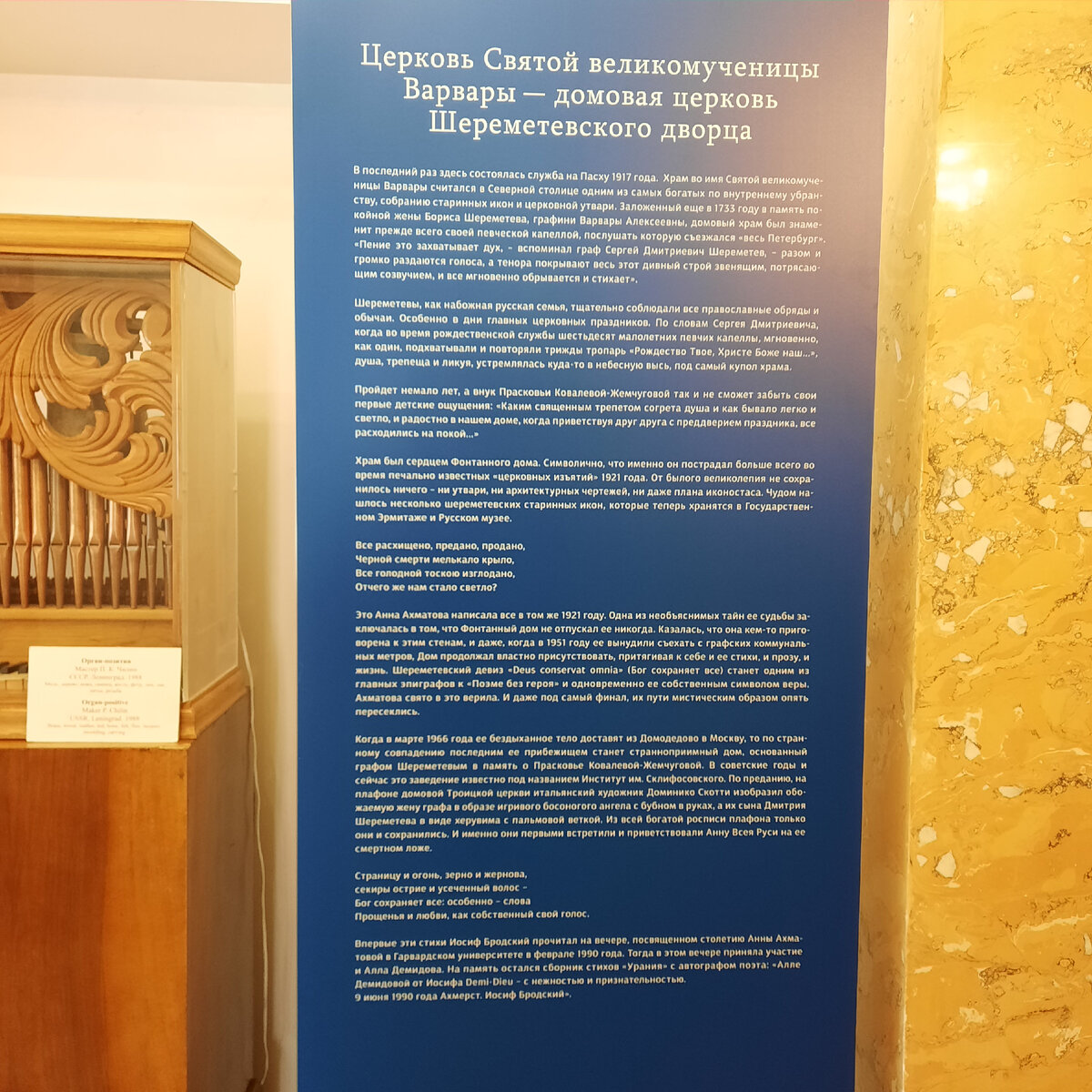 Эта домовая церковь была построена для любимой жены графа Шереметева Варвары Алексеевны, урожденной Черкасской. Она очень любила это святое место. Здесь хранилась частичка мощей Святой Варвары. В только что построенном храме был крещен граф Николай Петрович Шереметев. Это случилось в 1751 году. В одной из образных комнат храма был рожден и крещен единственный сын и наследник великого рода граф Дмитрий Николаевич. Через три недели после рождения сына там же скончалась графиня Прасковья Ивановна, которую все мы знаем как Парашу Жемчугову, крепостную актрису, в которую влюбился граф и, наперекор свету, женился на ней. Это зеркало хранит память о судьбе Параши. В верхнюю часть вставлен ее гребень времен крепостного театра. Портрет Параши Жемчуговой в роли Элианы, главной героини оперы «Самнитские браки» Гретри, именно эта роль сделала Прасковью знаменитой. Это семейное древо Шереметевых. Оно находится в другом зале, но здесь к месту будет поместить его. Дети семьи Шереметевых на одно