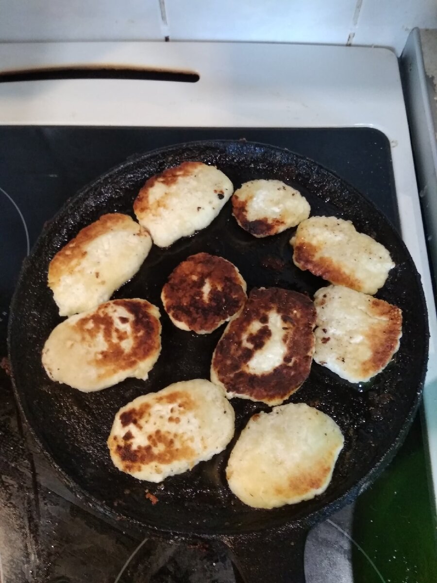- Скатать тесто колбаской на припыленной мукой поверхности, нарезать на блинчики и сделать из них не очень тонкие сырники округлой формы.