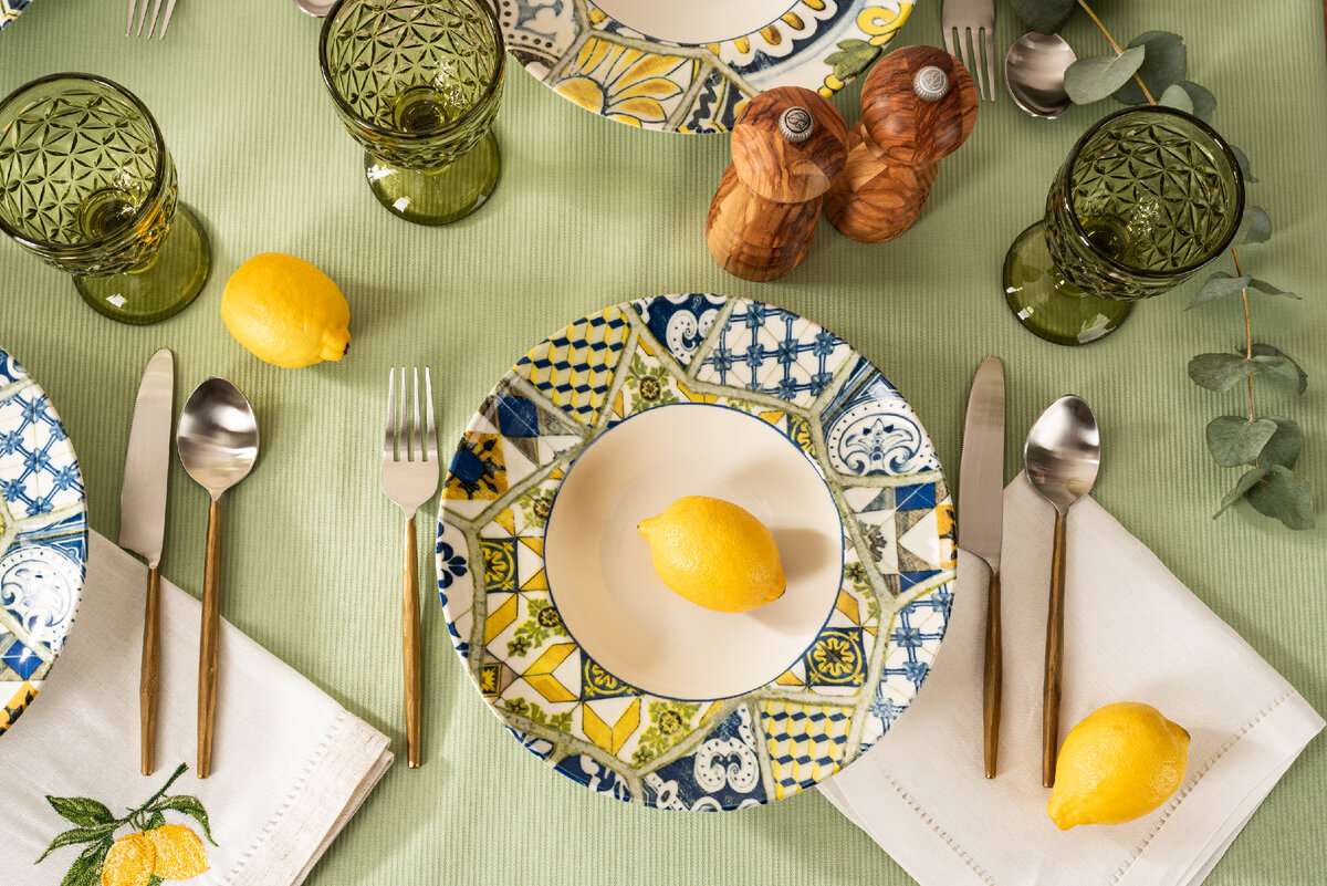 Весна - это время обновления, новых начинаний и потепления. Когда мир за окном начинает расцветать и распускаться, наступает идеальное время, чтобы обновить декор вашего дома и привнести немного весеннего настроения в помещение. А что может быть лучше, чем красиво украшенный стол? Будь то семейное собрание, особый случай или просто уютный вечер в кругу близких - продуманный до мелочей антураж может придать любому блюду настроение и задать тон трапезе. Если вы давно подписаны на наш канал, то, наверняка, знаете, что раз в сезон мы стараемся создавать оригинальные сервировочные сеты и генерировать идеи для украшения ваших завтраков, обедов, ужинов и чаепитий. В этом месяце нам очень не хватало витаминной свежести, которую дарят оттенки зелени и солнечные лучи. Поэтому мы решили восполнить этот дефицит в нашей сервировке! Один из отличных способов задать тон весеннему столу - использовать яркие, смелые цвета и игривые узоры. Например, мы решили взять великолепную скатерть оливкового цв