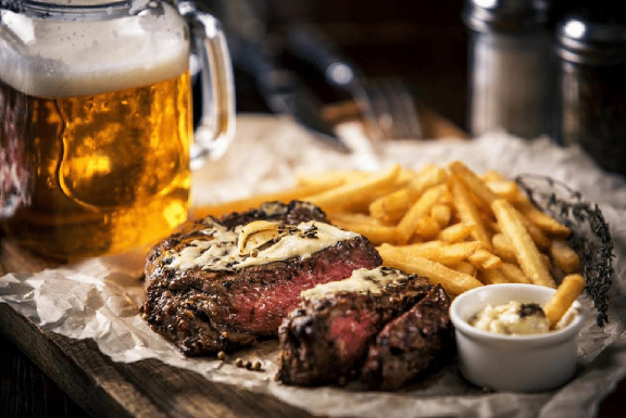 - Бифштекс с луком, Анджело, жареный картофель и бутылку басса . Принесите его в серебряной кружке с крышкой.