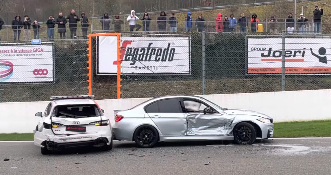 На кадрах, снятых в Бельгии на знаменитой трассе Спа-Франкоршам во время автомобильной гонки, мы видим, как BMW M3 врезается в Audi RS4 Avant. Инцидент произошёл в минувшие выходные во время Les Bruleurs De Gommes, который организатор рекламирует как «крупнейшее событие спортивных автомобилей» в стране. Несмотря на то, что столкновение произошло на относительно низкой скорости, последствия показывают, что обеим машинам потребуется дорогостоящий ремонт. Передняя пассажирская дверь BMW на замену, как и крыло, задняя дверь тоже повреждена, но в меньшей степени, выстрелила как минимум одна подушка безопасности. Также вытекла жидкость, что говорит о внутренних повреждениях. Что касается Audi, то повреждения намного глобальнее — ей потребуются новые: задняя дверь, фонари, бампер, не говоря уже о ремонте кузова начиная с крыльев. Машины, которые в тот момент были на трассе, ехали не так быстро, в том числе и M3 F80. Однако водитель BMW каким-то образом потерял контроль над спортивным седаном