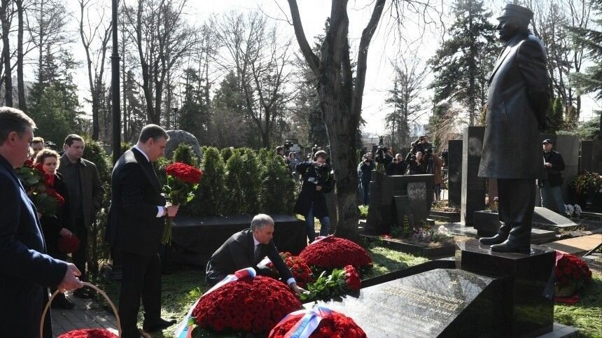 Монумент украсили цитатами выдающегося политика. Фото: © РИА Новости / Илья Питалев; 5-tv.ru В Москве в честь первой годовщины со смерти Владимира Жириновского открыли памятник в его честь. Скульптуру высотой 2,75 метра установили на его могиле на Новодевичьем кладбище. Корреспондент 5-tv.ru побывал на мемориальном мероприятии. Над монументом работал народный художник РФ Андрей Ковальчук. Как он сам отмечал, в своей работе она старался передать сильнейшую энергию и характер лидера партии ЛДПР. Памятник выполнен из бронзы, а его гранитное основание украшает цитата покойного деятеля. «Я буду защищать русских», — написано на камне. Кроме того, на памятнике выбиты слова Жириновского, которые он собирался сказать, оказавшись перед Богом. «Я не хочу здесь лежать в райском саду. Лучше я буду где-то в тайге идти полуголодный, но помогать людям», — напомнил автор скульптуры ответ политика. На церемонии открытия монумента на Новодевичьем кладбище присутствовали депутаты от всех парламентских пар