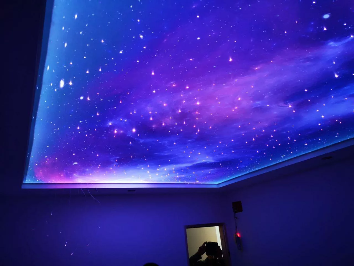Потолок звёздное небо представляет собой сложную конструкцию, которая состоит из натяжного полотна, генератора и галогенных ламп, предназначенных для подсвечивания потолочных элементов. Из-за того, что установка натяжного потолка звёздное небо своими руками достаточно сложная работа, её лучше всего доверить проверенным специалистам. Именно они в процессе монтажа «звёздного неба», протянут специальное оптоволокно к каждой светящейся точке натяжного потолка, после чего правильно подсоединят кабель к проектору. Здесь при самостоятельном монтаже без необходимых знаний и опыта не обойтись. Также, следует знать, что основная сложность при подключении потолка звёздное небо, заключается в установке генератора. Данное устройство отвечает за свечение ламп разноцветными огнями. Именно за счёт них, на потолке могут генерироваться различные эффекты — «полёт кометы» или «северное сияние». Рассчитай стоимость потолка бесплатно - https://sky-city-spb.ru