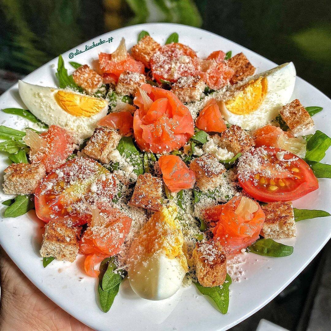 🥗Цезарь с лососем и пармезаном – идеальное сочетание! КБЖУ на порцию = 311,6/29,2/16,8/10,9 Ингредиенты: Слабосоленый лосось – 80 грамм Яйцо – 1 шт. Руккола, черри - 120 грамм Хлеб цельнозерновой – 10 грамм Тертый🧀пармезан – 5 грамм Лимон 🔸1. Яйцо отвариваем 10 минут, остужаем и разрезаем на 4 части. Черри разрезаем пополам. Хлеб нарезаем кубиками и обжариваем на сухой антипригарной сковороде. 🔸2. Соединяем все ингредиенты, сбрызгиваем соком🍋лимона и посыпаем пармезаном. Мне по вкусу достаточно только лимона, но как вариант, для заправки, можно использовать зернистую горчицу, греческий йогурт, оливковое масло и тд. ❤️Приятного аппетита❤️