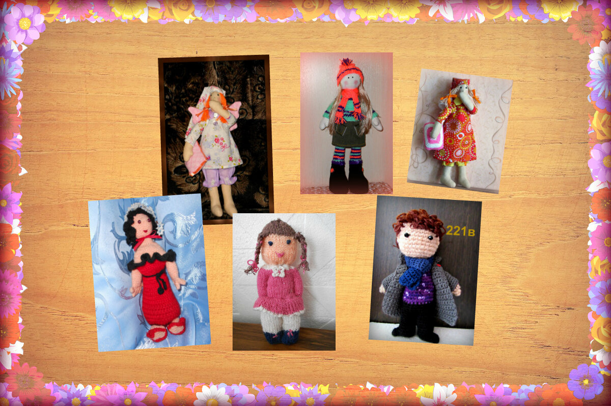 Рада приветствовать всех, заглянувших на огонёк! Сегодня у меня маленькая подборка рукодельных кукол. Настолько маленькая, что было бы логичнее оформить её в виде поста, а не в виде статьи. Но фотографии все вертикальные, и я не уверена, будут ли они хорошо смотреться в посте (что-то может подрезаться или ещё сильнее сузиться). Поэтому пусть будет статья. Весь хоровод кукляшек можно увидеть на этом коллаже, а ниже покажу каждую игрушку крупным планом. Вязаная крючком барышня в шляпке, длинном сарафане и сланцах)) Отдыхающая)) Забавная девчонка с косичками (вязание спицами) Шерлок - и этим всё сказано))) Единственный представитель сильного пола в этой кукольной компании)) Две Тильдочки-сплюшки Сплюшек ещё называют сонными ангелами, поэтому их непременный атрибут - крылышки. Есть и ещё несколько обязательных условий: одна рука у рта (маскирует зевок), в другой руке подушка. Одежда - пижамка либо ночнушка, на голове колпачок, а ноги чаще всего босые. Вот по этим канонам и мастерила)) Счи