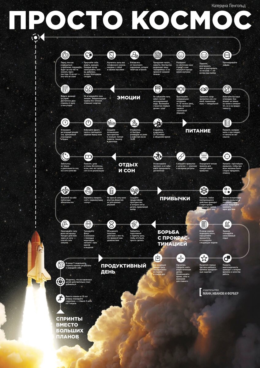 Открываю новую рубрику, в которой буду делиться отзывами об интересных книгах по планированию, саморазвитию и личной эффективности: "Просто космос" Катерина Ленгольд "Вы сможете достигнуть чего угодно, когда перестанете делать все подряд" Мой рейтинг ★★★★★★★★★☆ (9 из 10) Нет ничего лучше насыщенной пользой и опытом автора книги. Нет, вру, есть - когда эта книга ещё и БЕЗ ВОДЫ! Вот честно, вся литература по планированию, саморазвитию имеет характерную черту - авторы пытаются растянуть одну-две мысли на 300 страниц. Книга же "Просто космос" читается за 2-3 часа, при этом я устала выделять маркером интересные места. Автор книги в 14 лет поступила в университет, а в 23 года стала вице-президентом аэрокосмической компании, при этом она отрицает свою принадлежность к вундеркиндам и отмечает, что добилась всего исключительно с помощью труда и упорства. Поэтому ей точно есть, что поведать о планировании и движении к целям. Она рассказывает про agile-подход к жизни, формулу продуктивного дня,