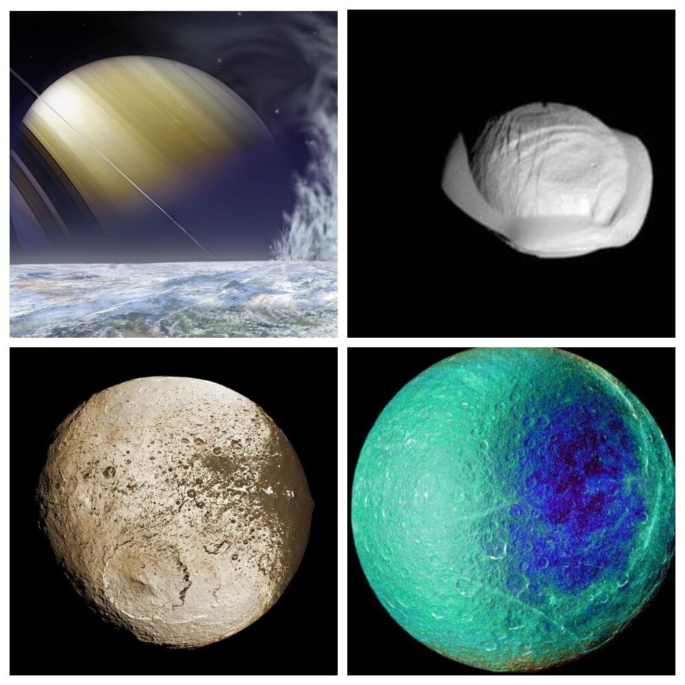 У Сатурна внушительная система спутников: она насчитывает десятки лун, разбросанных на огромном просторе от внутренних колец планеты до 13 миллионов километров, где вращается гигантское кольцо Фебы.