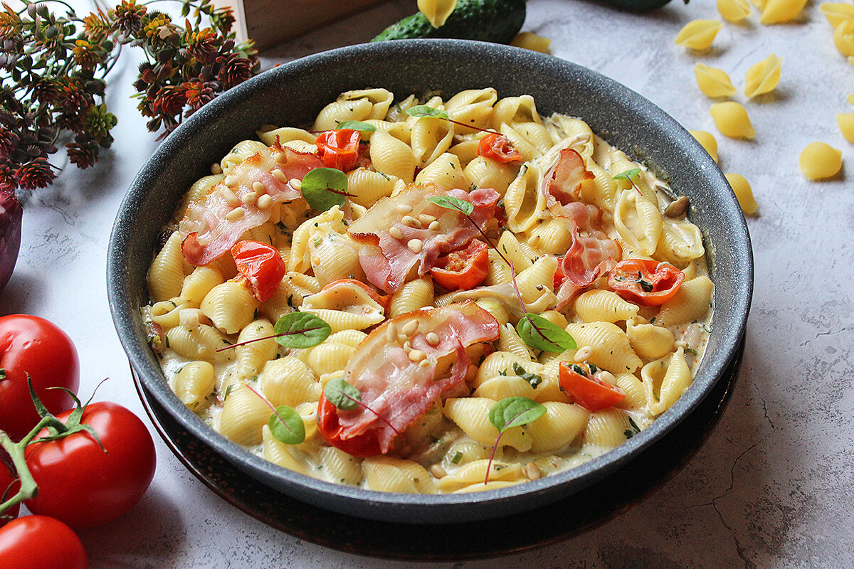 Больше не надо думать, что приготовить на обед. Паста с грибами, грудинкой и сыром фета