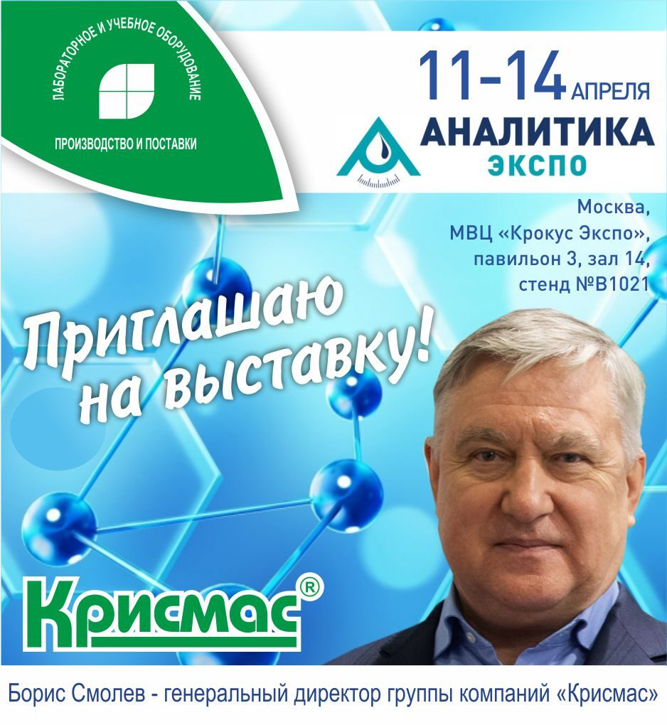 Уважаемые коллеги! Друзья! Я, Борис Смолев генеральный директор группы компаний «Крисмас», приглашаю Вас с 11 по 14 апреля 2023 года посетить стенд нашей компании (№В1021) на ХХI международной выставке лабораторных технологий, оборудования, химического анализа, мебели, химических реактивов и материалов «Аналитика Экспо». Мероприятие будет проходить в Москве, МВЦ «Крокус Экспо», павильон 3, зал 14. ГК «Крисмас» является постоянным участником данной выставки. В этом году в составе коллективного стенда компаний-участников НП «Росхимреактив» №B1021 будут продемонстрированы возможности ГК «Крисмас» по основным направлениям деятельности: ● комплексное оснащение производственных, научных, учебных лабораторий https://shop.christmas-plus.ru/catalog/; ● оборудование для газового анализа https://shop.christmas-plus.ru/catalog/oborudovanie_dlya_gazovogo_analiza/; ● оборудование для анализа воды и водных растворов https://shop.christmas-plus.ru/catalog/oborudovanie_dlya_analiza_vody/; ● оборудовани