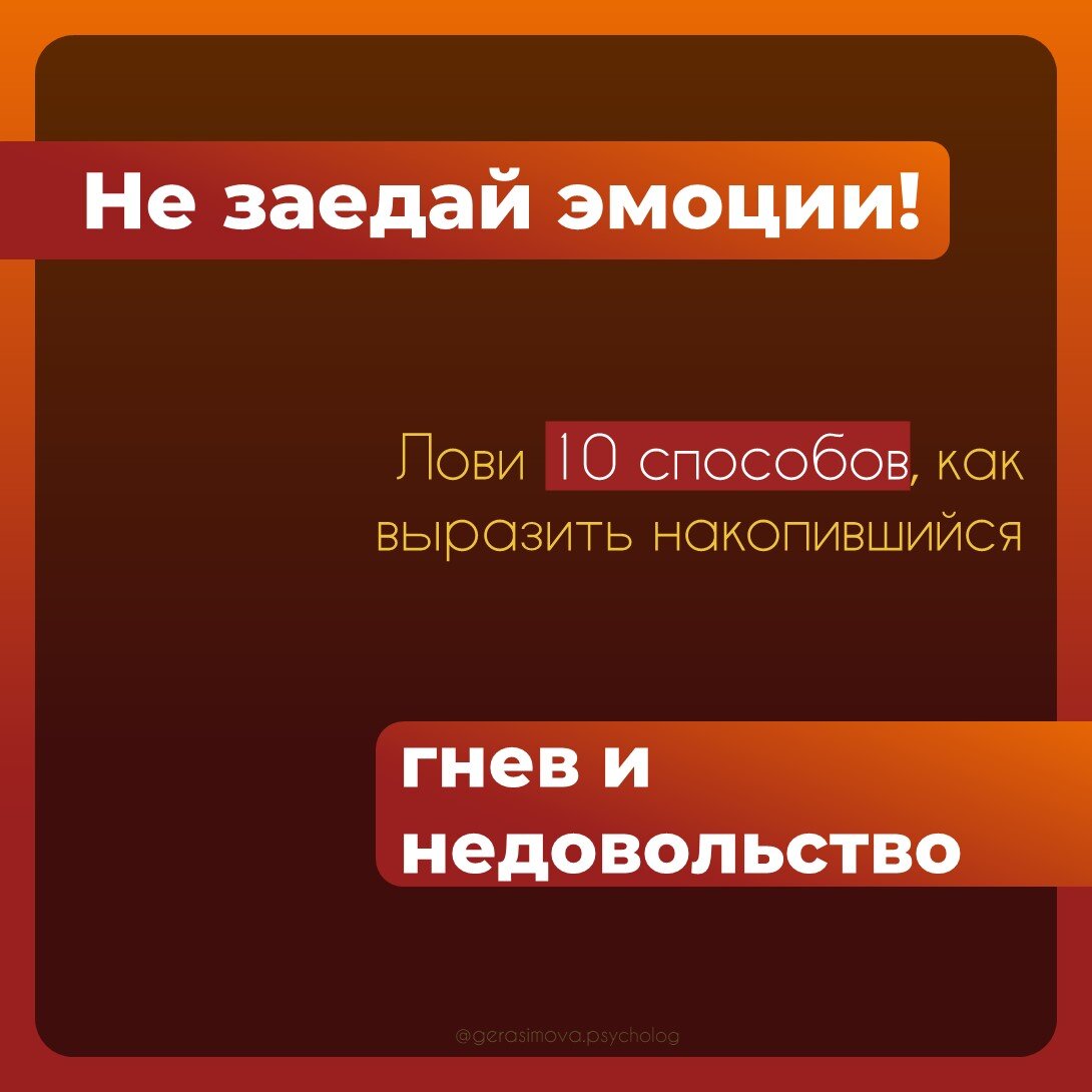 Стоп! Хватит едой запихивать внутрь себя гнев и недовольство. Там итак уже скопилось предостаточно. Я не раз говорила, что жир — это идеальный консервант для подавленных эмоций. Жир оберегает вас от катастроф: физических болезней, социальных конфликтов, других сильных стрессов. С точки зрения тела нарощенная «броня» наносит организму гораздо меньше разрушений, чем бушующие внутри страсти. Если вы привыкли прибегать к еде, как к средству для успокоения, то этот чек-лист поможет вам обрести альтернативные способы выражения гнева и недовольства. Зачем? А всё просто. Если вы хотите сбросить лишний жировой балласт, научиться по-разному выражать эмоции жизненно необходимо. Вот эти 10 способов: Знаете ещё способы? Делитесь своими полезностями в комментариях. И сохраняйте себе мои. Да, главное — практикуйте! За подписку и лайк сердечно благодарю! #эмоциональная еда #злость #недовольство #какпохудеть #психогигиена #психологиялишнеговеса #эмоциональноепереедание