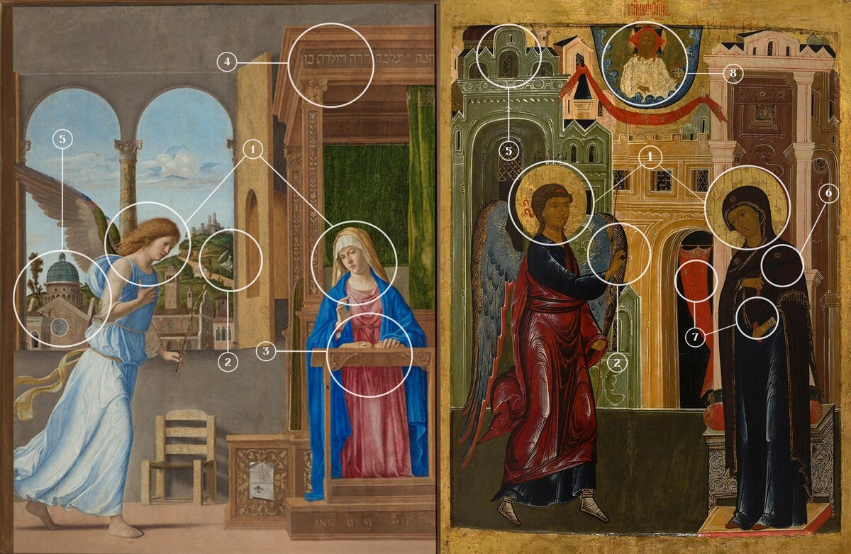 Сцену Благовещения легко узнать по двум главным действующим лицам: Дева Мария и Архангел Гавриил. И в восточной, и в западной традиции Мария изображается справа, а Гавриил – слева. При создании художественных образов мастера опирались на два библейских текста: фрагмент Евангелия от Луки (Лк. 1, 26-38) и апокрифическое Протоевангелие от Иакова – текст середины II века, в котором описаны сцены из жизни Пресвятой Девы Марии вплоть до Рождества Христова.