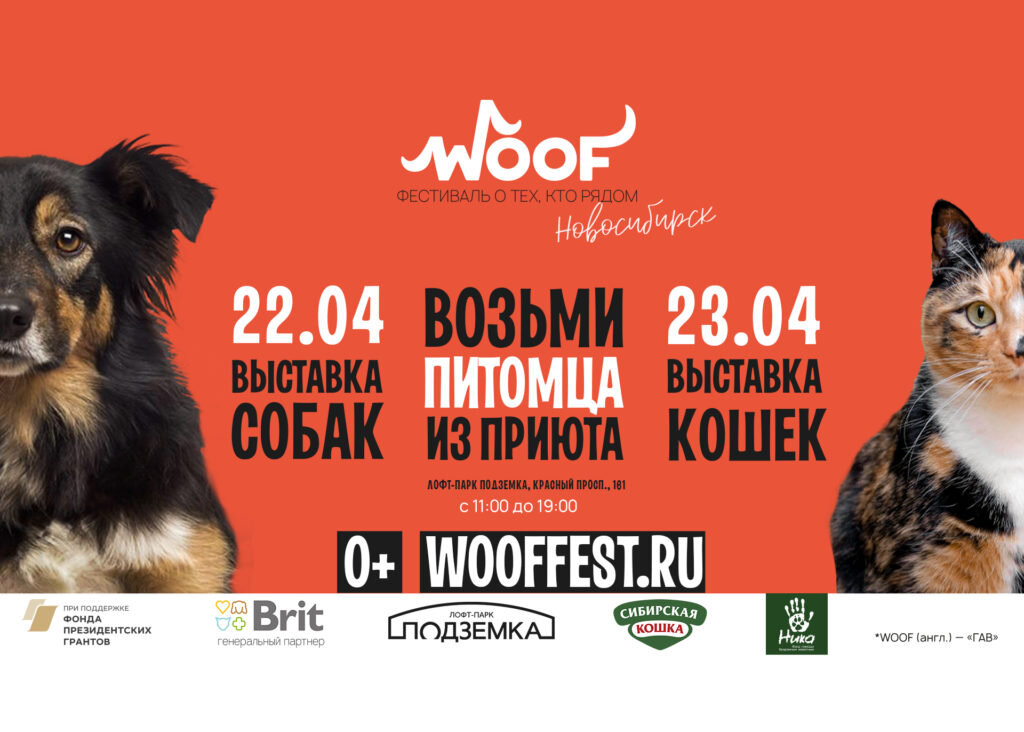 Задача фестиваля – найти дом животным из приютов, познакомить жителей города с проблемой и рассказать о возможности помочь бездомным кошкам и собакам простыми способами. Благотворительный фестиваль WOOF пройдет в Новосибирске 22 и 23 апреля – 40 собак и 70 кошек приедут в лофт-парк «Подземка» в поисках своей семьи. Задача фестиваля – найти дом животным из приютов, познакомить жителей города с проблемой и рассказать о возможности помочь бездомным кошкам и собакам простыми способами. Проведение фестиваля стало возможным благодаря поддержке Фонда президентских грантов, генерального партнера Brit и бренда «Сибирская кошка». Все животные-участники фестиваля привиты, стерилизованы, обработаны от паразитов и пристраиваются строго по договору ответственного содержания. Гостей ждут фото-зона, мастер-классы, фотовыставка и зона с активностями для детей, а бренды Brit и «Сибирская кошка» подготовили подарки для новых владельцев животных. «На фестивале WOOF гости в комфортной обстановке могут не т