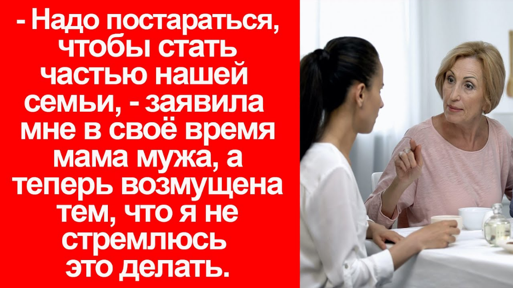 «Надо постараться, чтобы стать частью нашей семьи», заявила мне в своё время мама мужа, а теперь возмущена тем, что я не стремлюсь это делать. Когда я второй раз выходила замуж, у меня уже был полностью сформирован характер и был свой взгляд на то, как следует выстраивать отношения с родственниками мужа. Перед первой свекровью я по молодости лет и о грехам воспитания старалась прогнуться до хруста в лопатках. Это же мама мужа, я должна ей нравиться. 10 лет от меня только и было слышно «да», «мама», «хорошо», «мама», «сделаю», «мама».