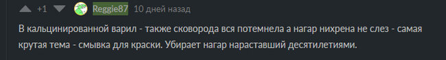 В общем не стал пилить ответы на ответы итд, решил запилить свой опыт чистки советской сковородки. Предыстория такая. Сам я из глубинки Воронежской области и когда пришлось ехать учиться из родного дома, мама мне помимо всякой посуды (которую не жалко), отдала старую советскую сковороду. Даже тогда она была в огромном количестве нагара. В причины вдаваться не будем, пост не об этом. Если коротко, сковородка прошла со мной все годы обучения, потом годы холостой жизни и даже пришлось ей послужить в годы когда я женился. Сковорода обрастала нагаром все сильнее и сильнее и уже ее не брала вообще ни какая бытовая химия из супермаркетов. Жена эту сковородку тоже полюбила и пыталась ее привести в порядок, но безуспешно. Позже сковорода обросла нагаром до такой степени, что при готовке нагар стал отваливаться и попадать в еду, поэтому стали использовать ее крайне редко и в особенности для жарки пирожков и котлет. А попытка пожарить на ней картошку приводила к тому, что картошка была перемешана