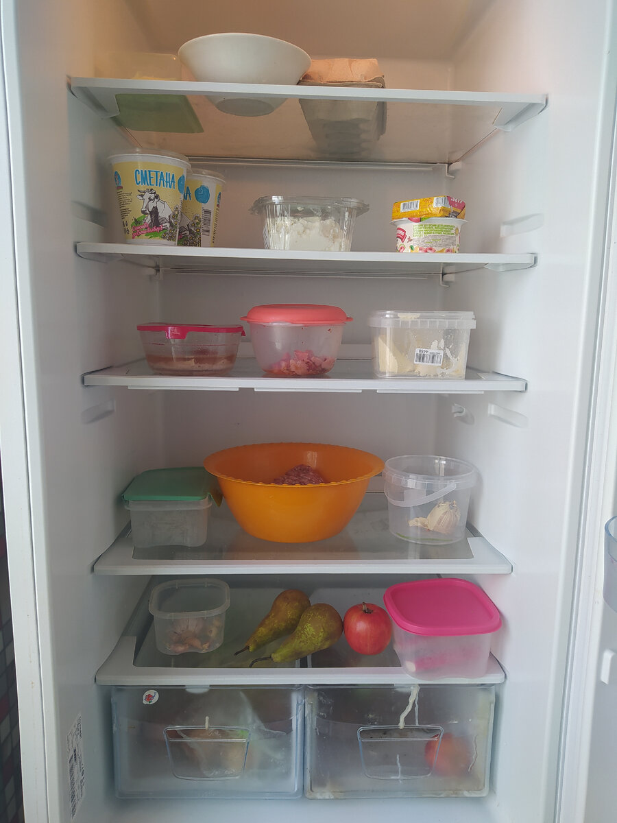 Привет🥰 Ещё с утра была уверена, что без похода в магазин сегодня не обойтись. Но хорошенько пошерстив по сусекам, пришла к неоднозначному выводу, что сегодня обойдёмся. Итак, в холодильнике нашлось два вида фарша в тазу. Хорошая порция творога, половина сметаны, творожок, солёный огурец припрятанный для Вани и остатки солёной горбуши. По два яйца сырых и отварных. Масло пайковое и хорошее. Половина заброшенного помидора. Остатки печени трески, протезы краба, хвост паштета, жутко ароматный сыр маасдам, чеснок, всё. Две груши и яблоки. В духовке томится коврижка. Кароче, думаю обойдёмся всё же.