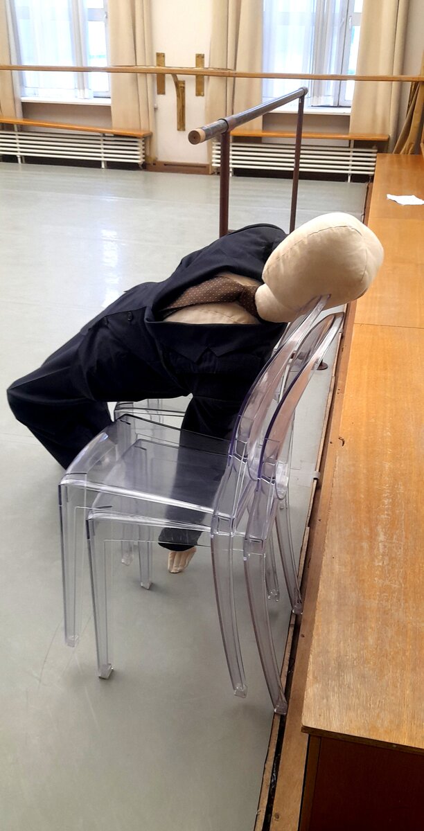 Захожу я сегодня в класс, вся в своих мыслях. А там... Я не сразу поняла, что это всего лишь бутафория. Думала человек сидит. Точнее полулежит. А это всего лишь тряпичная кукла. Прямо как в балете "Петрушка". Том, старом, Фокинском.