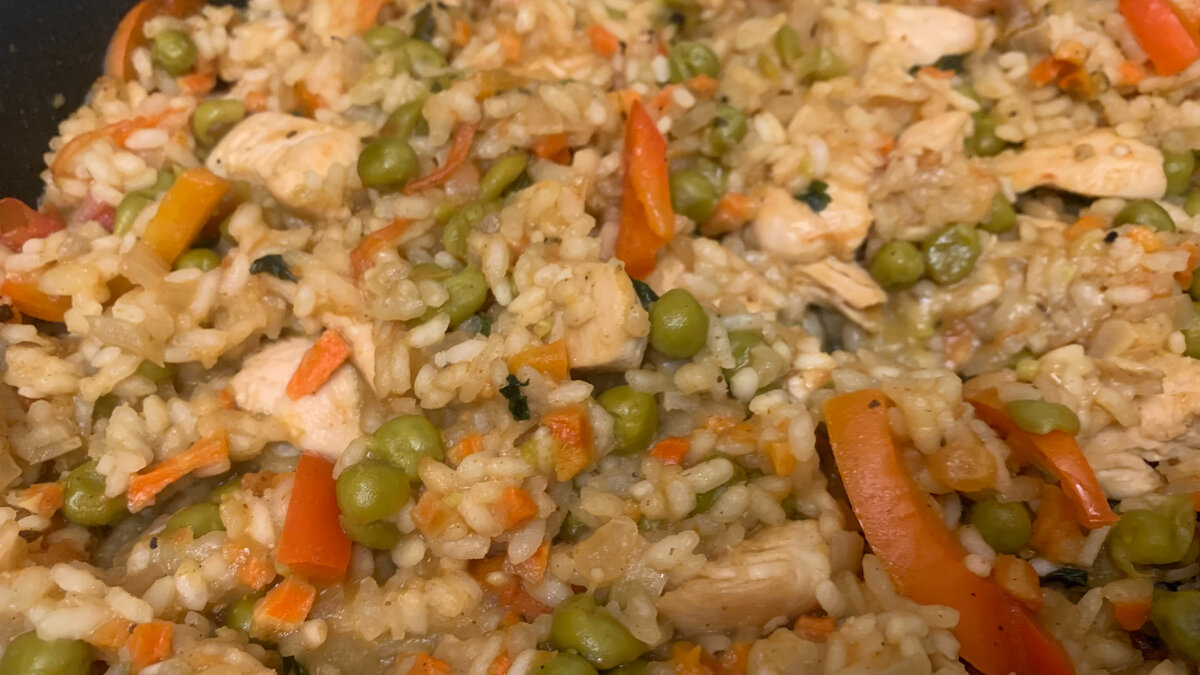 Испанское блюдо, которое в каждом доме Испании готовят по-своему. Рецептов огромное количество с абсолютно разным набором ингредиентов. Нам довелось побывать в Испании и попробовать паэлью с морепродуктами, но мы все же любим больше птицу, поэтому хотим с Вами поделиться рецептом, который нам очень понравился. Нам понадобится: Для паэльи существует специальный сорт риса, если его нет дома, то можно использовать круглозёрный. Специи: ШАФРАН. Существуют специальные смеси для паэльи с его добавлением, либо его просто добавляем отдельно со своими любимыми специями (перец/соль). Считается, что паэлья без него не паэлья. Горошек: желательно замороженный, но мы использовали простой консервированный - тоже вкусно. Обжариваем кусочки курочки на сковороде до золотистого цвета Убираем курочку в тарелку. На этой же сковороде обжариваем лук и чеснок, все время перемешивая. Добавляем помидор, продолжаем перемешивать пару минут. Добавляем перец и еще пару минут помешиваем. Возвращаем нашу курочку,