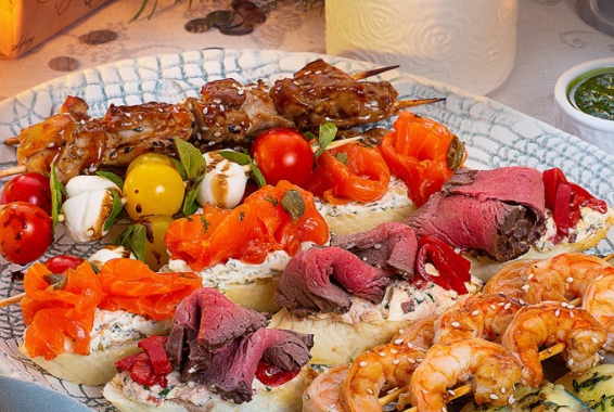 Средиземноморское плато мини-шашлычков из креветок и куриных бёдрышек, брускетт с ростбифом и семгой и канапе «Капрезе» с соусом песто
