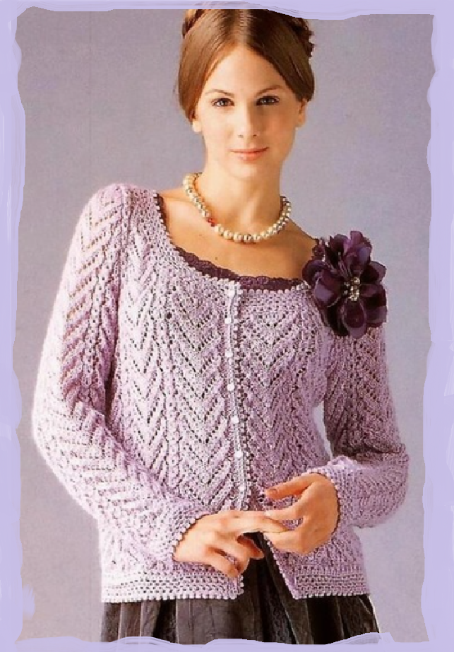 Лавандовый цвет - нежный цвет фиолетового оттенка, который замечательно сочетается с другими цветами. Одежда лавандового цвета очень нравится модницам. Этот цвет позволяет создавать образы в романтичном, гламурном и бохо стиле. Этот цвет ассоциируется с нежностью и загадочностью - истинно женственные свойства. Стильный цвет, даже в полутонах и оттенках, вещи созданные из лавандового цвета помогут создать великолепный и модный образ. Жакет спицами с отделкой крючком. Великолепный ажурный узор в лавандовом цвете смотрится нарядно. Отделка горловины, низа рукавов и самого жакета дополняет основной узор. Пуловер светлого лавандового оттенка. Простая выкройка и прямой рукав со спущенной линией проймы делают пуловер свободным и комфортным. Красивое основное полотно ажурного узора с частичными косами дополняет простая лицевая гладь рукавов. Болеро. Шалевый воротник, рукав-погон плюс красивый простой узор - в результате получается замечательная стильная вещь конечно в лавандовом цвете. Пулове