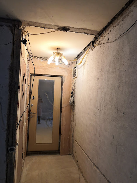 Первые две статьи про ремонт можно посмотреть здесь👇 По словам мужа, самое сложное в ремонте - это черновая отделка стен. А причина в том, что стены никакие: все в дырах, с промежутками вверху, не прикрепленные к потолку и еще много всего. Но обо всем по порядку. Когда мы жили в однокомнатной квартире и муж делал там ремонт, он плевался от стен, потому что они были из пустотелого шлакоблока. Но в этой квартире он был уверен, что со стенами проблем не будет, они ведь из цельных плит. Отштукатурил и все. Ага, как же! Когда он содрал обои, которые, к слову, были приклеены к слою многочисленных прежних обоев и от этого еле держались, он был в шоке. Потому что под обоями были не только прежние обои, но и много другого интересного, что потребовало много дополнительного рабочего времени. Посмотрите на эти прекрасные стены, особенно на их верхнюю часть. Перегородки стоят на полу а сверху есть пустое расстояние до потолка, которое заполняется заботливыми строителями досками, перемотанными